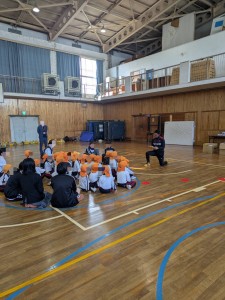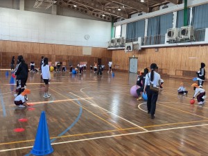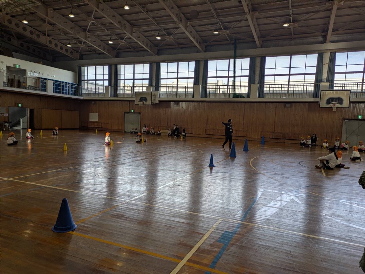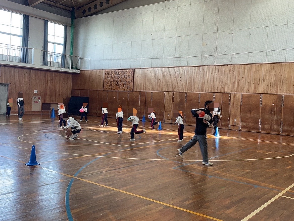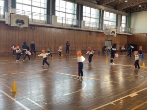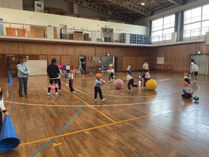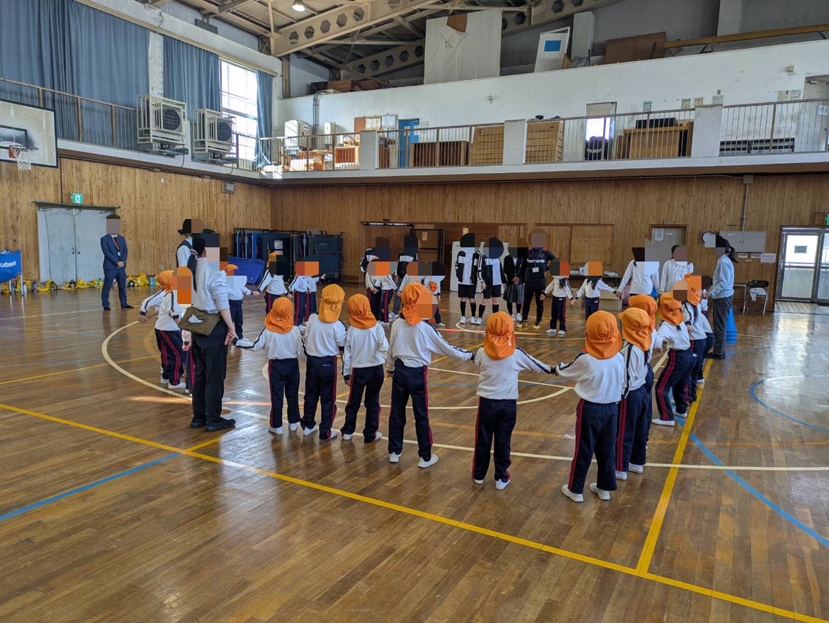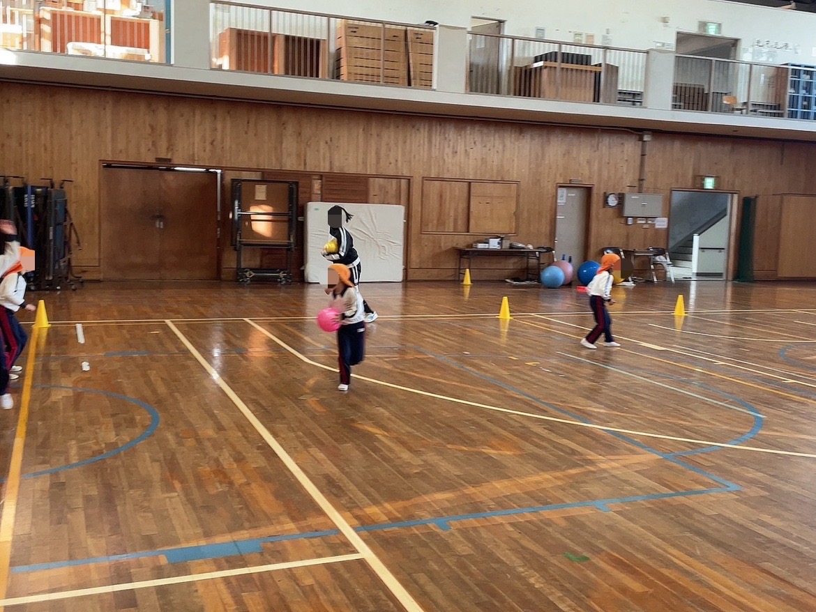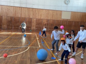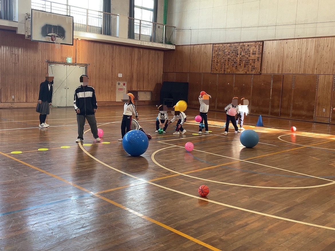 本日、5限目、保育遊びプロジェクト第5弾として、認定こども園五風会のこどもたちを岸城中学校に招待して、ボール遊びや体を使った遊びなどを楽しみました。