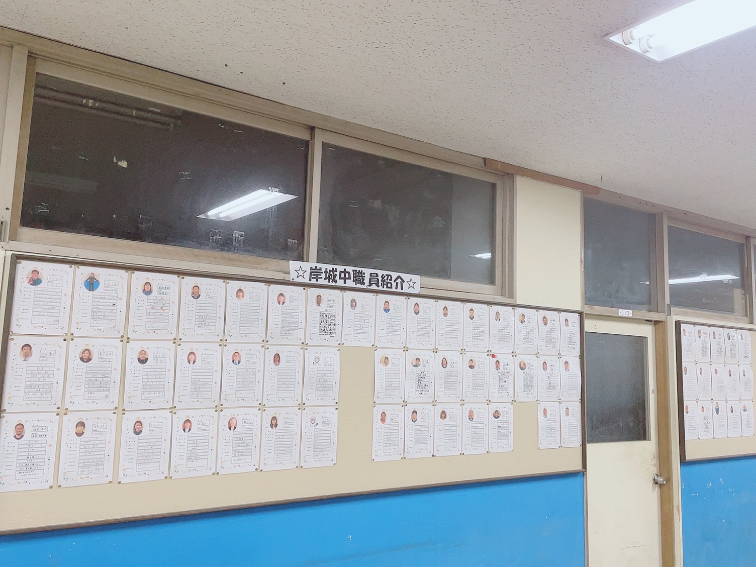 岸城中学校では、職員室前に職員の紹介を掲示しております。