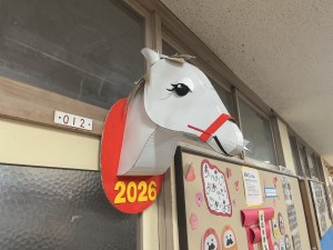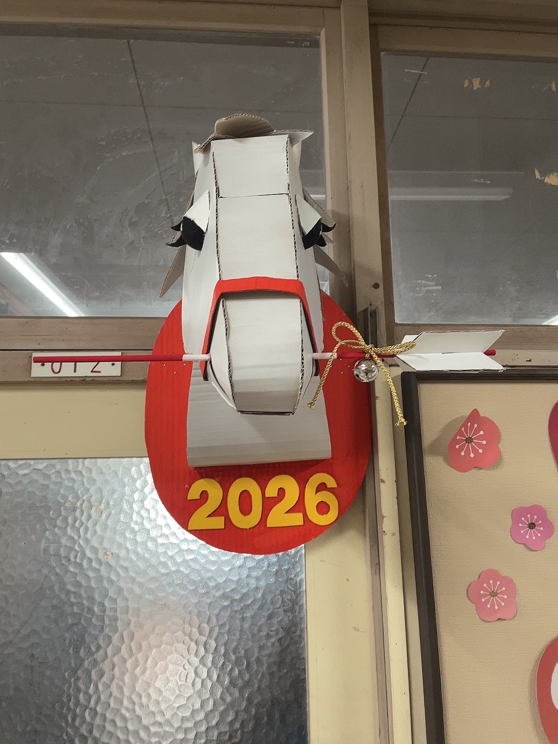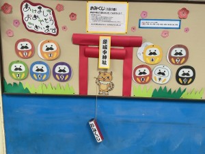 岸城中学校では、職員室前に岸城中神社の鳥居を作り、そこにおみくじを提げてます。