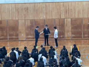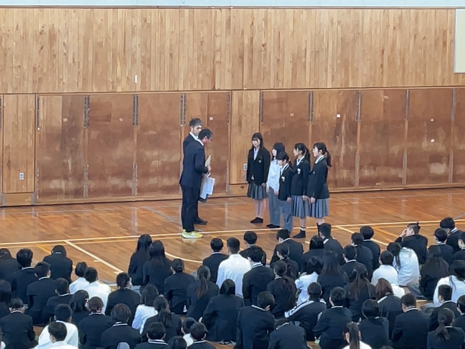 下は、①陸上部の表彰、②夏休み3行詩コンクールの表彰、③生徒会サミットの報告、④生徒会長のあいさつ、⑤集会の様子です。
