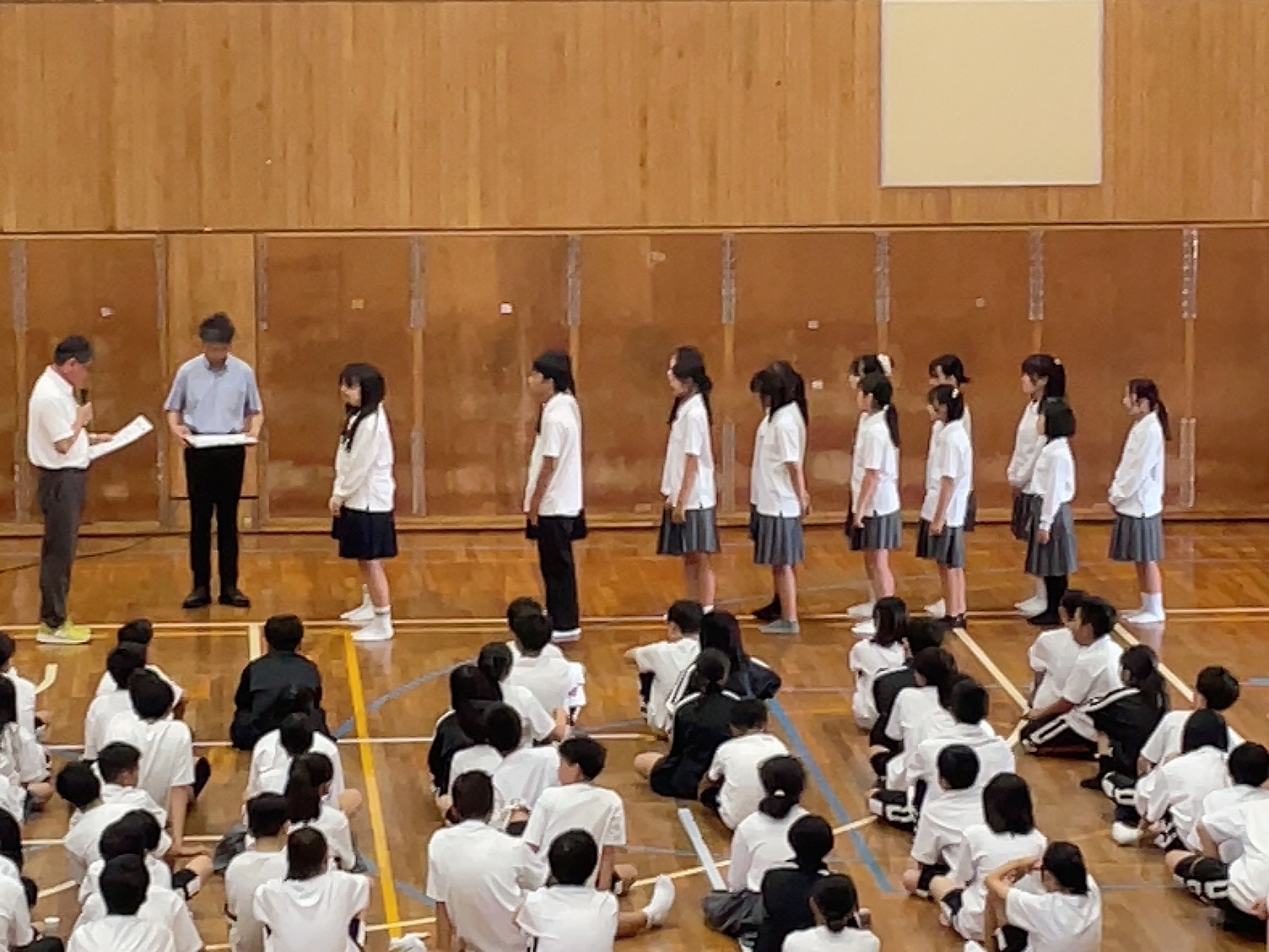 生徒会サミット2025の活動報告、服の力プロジェクトの活動報告、岸城中学校のマスコットキャラクターである「キトラ」の発表、体育大会の生徒会種目の説明等、生徒会の役員で分担して、しっかりと説明してくれていました!
