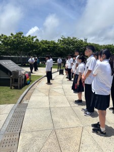 平和セレモニーでは、今まで学んだことを思い返しながら、黙祷をささげ、「島唄」を歌いました。