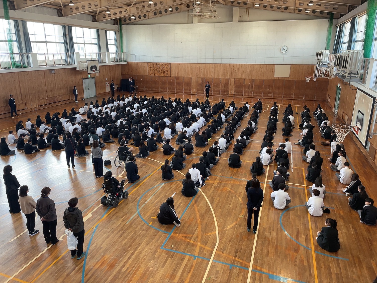 3年生のいない広い体育館で、1,2年生だけで今年度の最後のしめくくりが行われました。